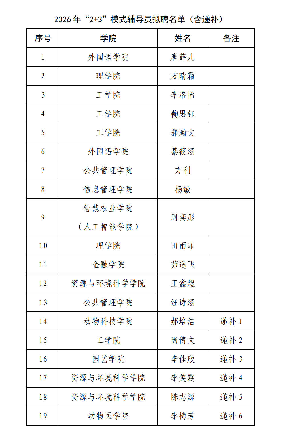 根据学校相关工作要求,经个人申报、学院推荐、资格审查、学校评审,根据选聘综合成绩确定唐薛儿等13人进入南京农业大学2026年“2+3”模式辅导员拟聘名单,现将拟聘人员名单予以公示。