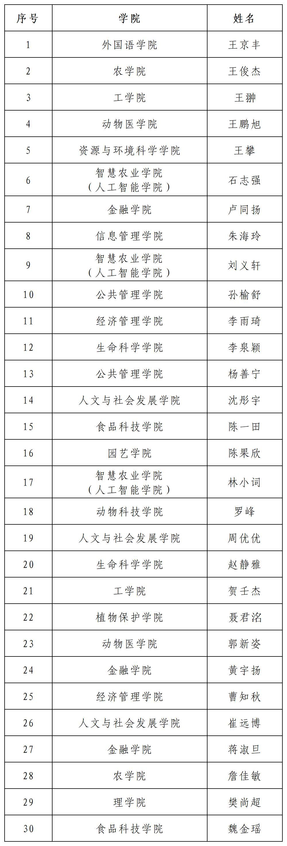 根据《关于开展南京农业大学2025年“瑞华杯大学生年度人物”评选活动的通知》要求,经个人报名、学院初评、资格审核、材料评审等环节,共有30名本科生入围学校复评环节,具体名单如下(按姓名姓氏笔画排序):
